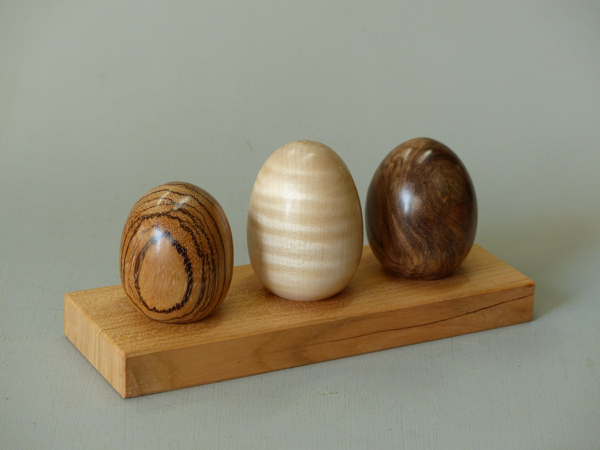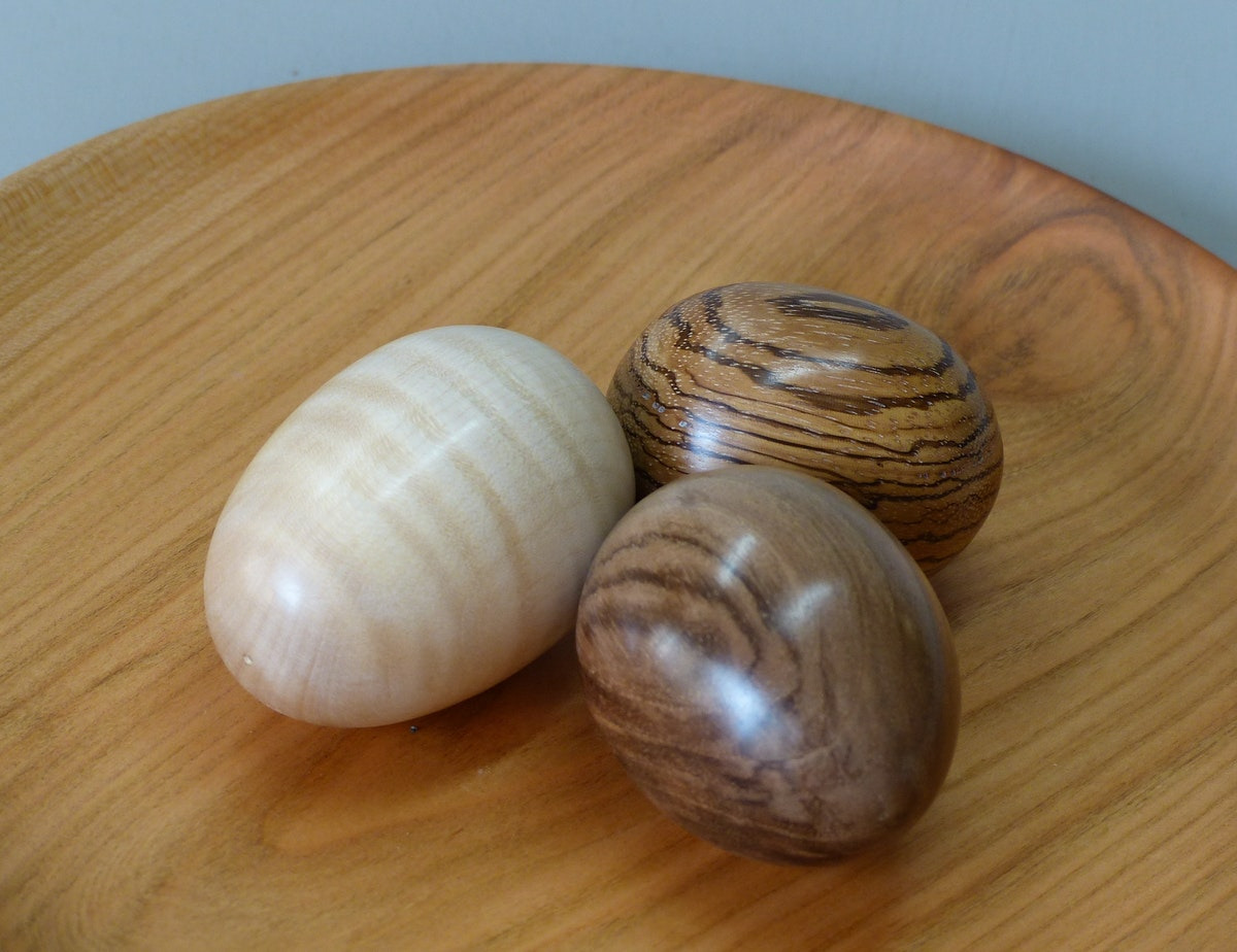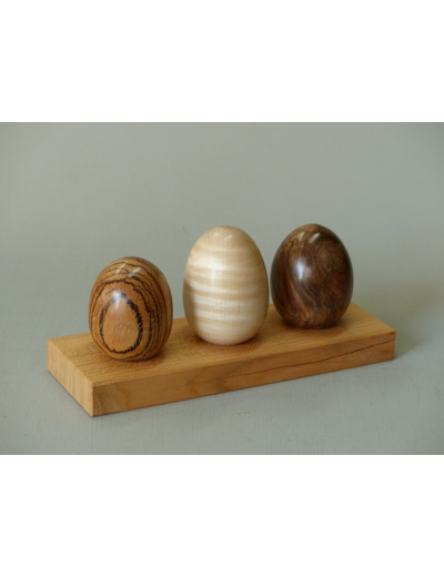 Information sur notre produit : Trois Oeufs de pâques, Sycomore ondé, zébrano et noyer