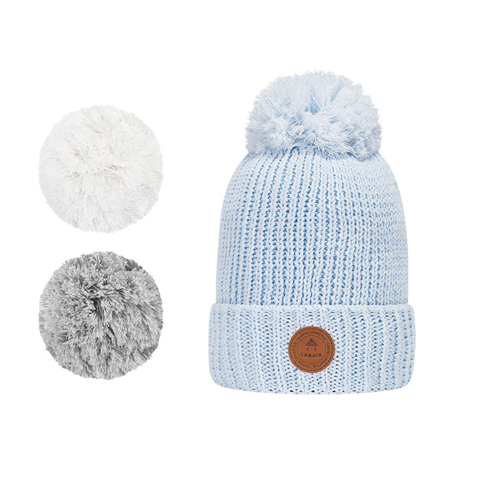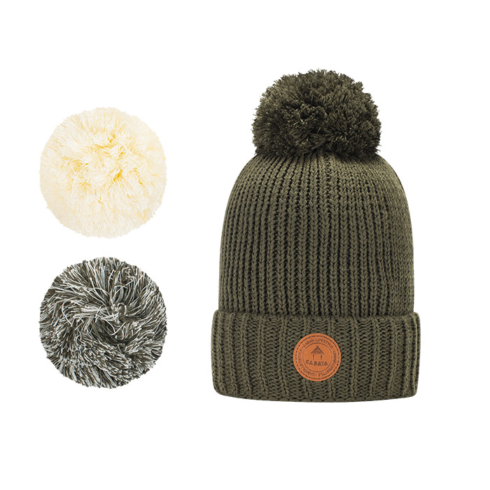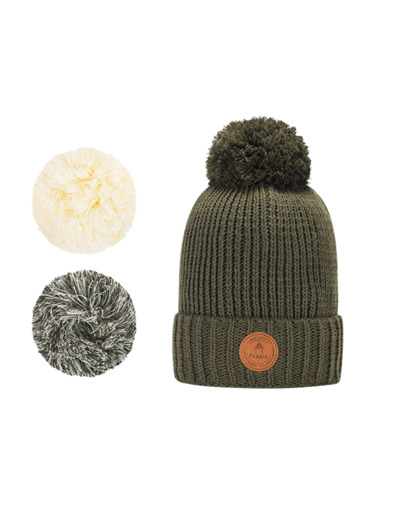 Super bonnet Cabaïa Green à pompons interchangeables. Un bonnet tout doux, avec ses 3 pompons interchangeables grâce à un système d'aimant puissant, pour assortir votre bonnet à toutes vos tenues et à votre humeur. Un bonnet éco responsable tricoté en matières recyclées.