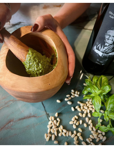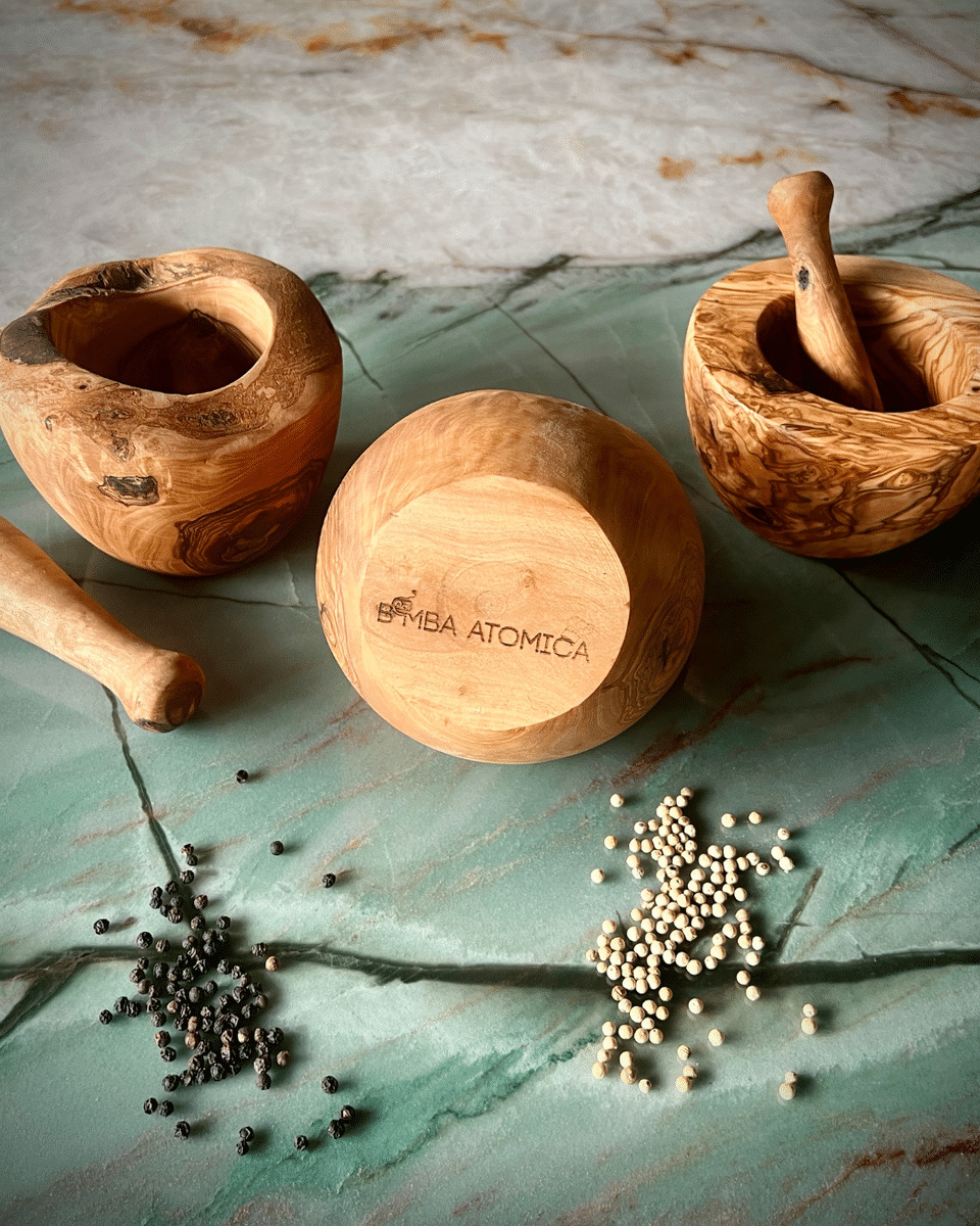 Le Mortier et le Pilon Bomba Atomica en bois d’olivier sont des outils traditionnels utilisés dans la cuisine pour la préparation de sauces, de pesto, d’épices et d’assaisonnements de manière efficace, offrant plus de contrôle sur la consistance du produit final.