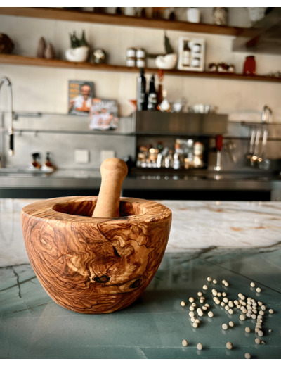 Les veines naturellement contrastées du bois d'olivier, font de chaqune des nos mortiers rustiques, un modèle unique.