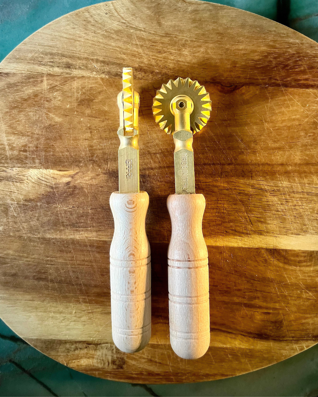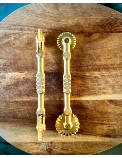 - Roulette coupe-pâtes double : Deux lames dentelées (5 mm et 3 mm), entièrement en laiton.