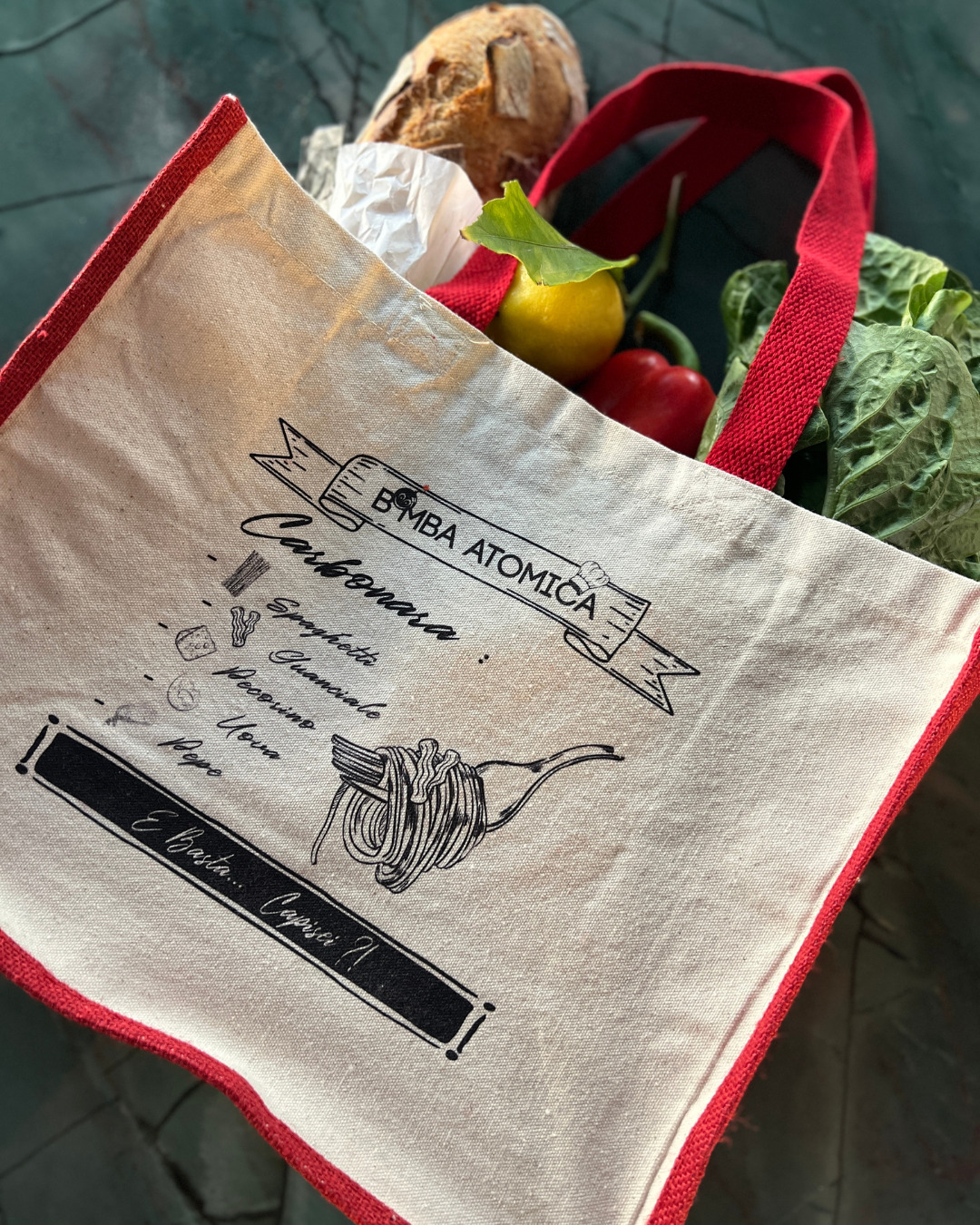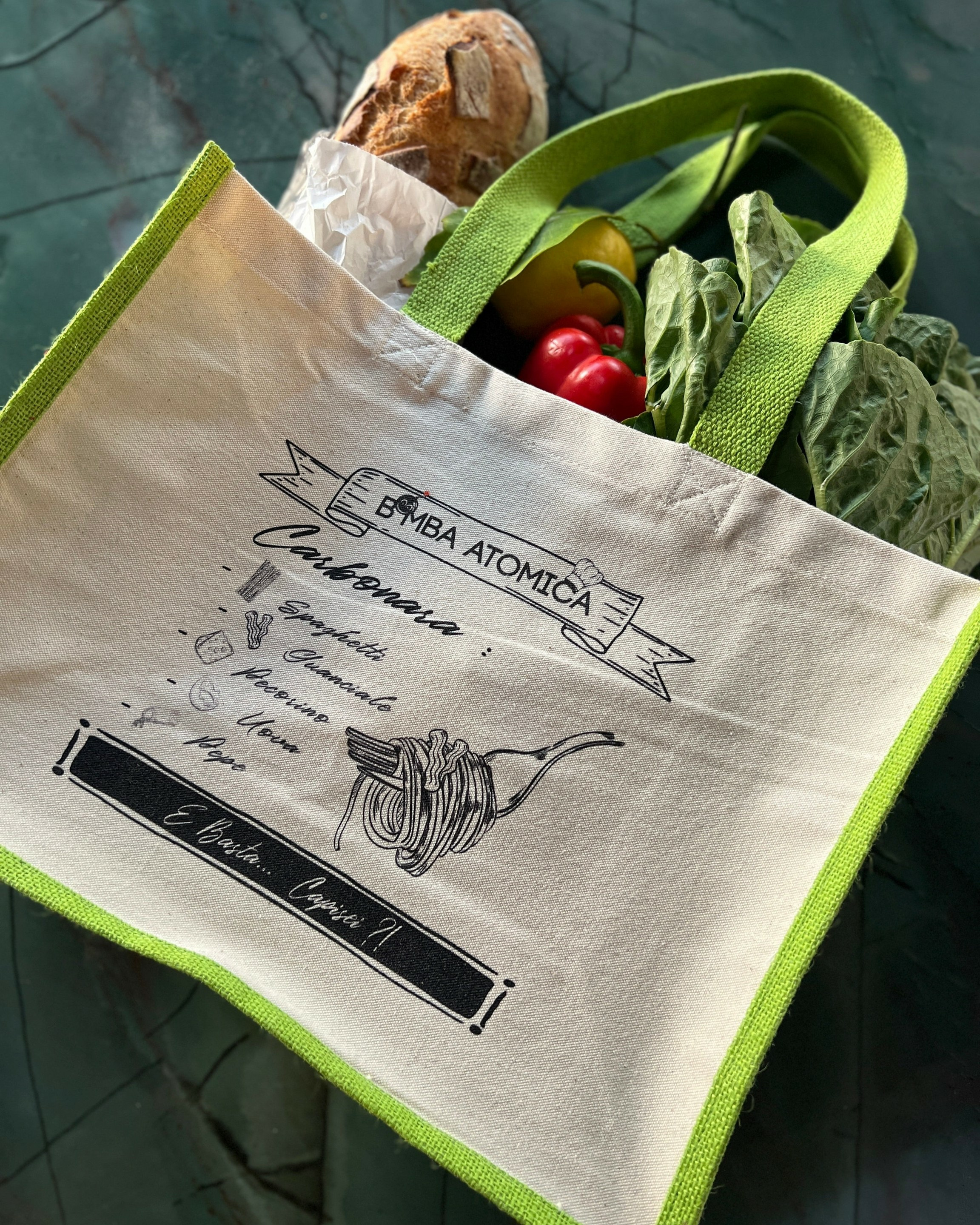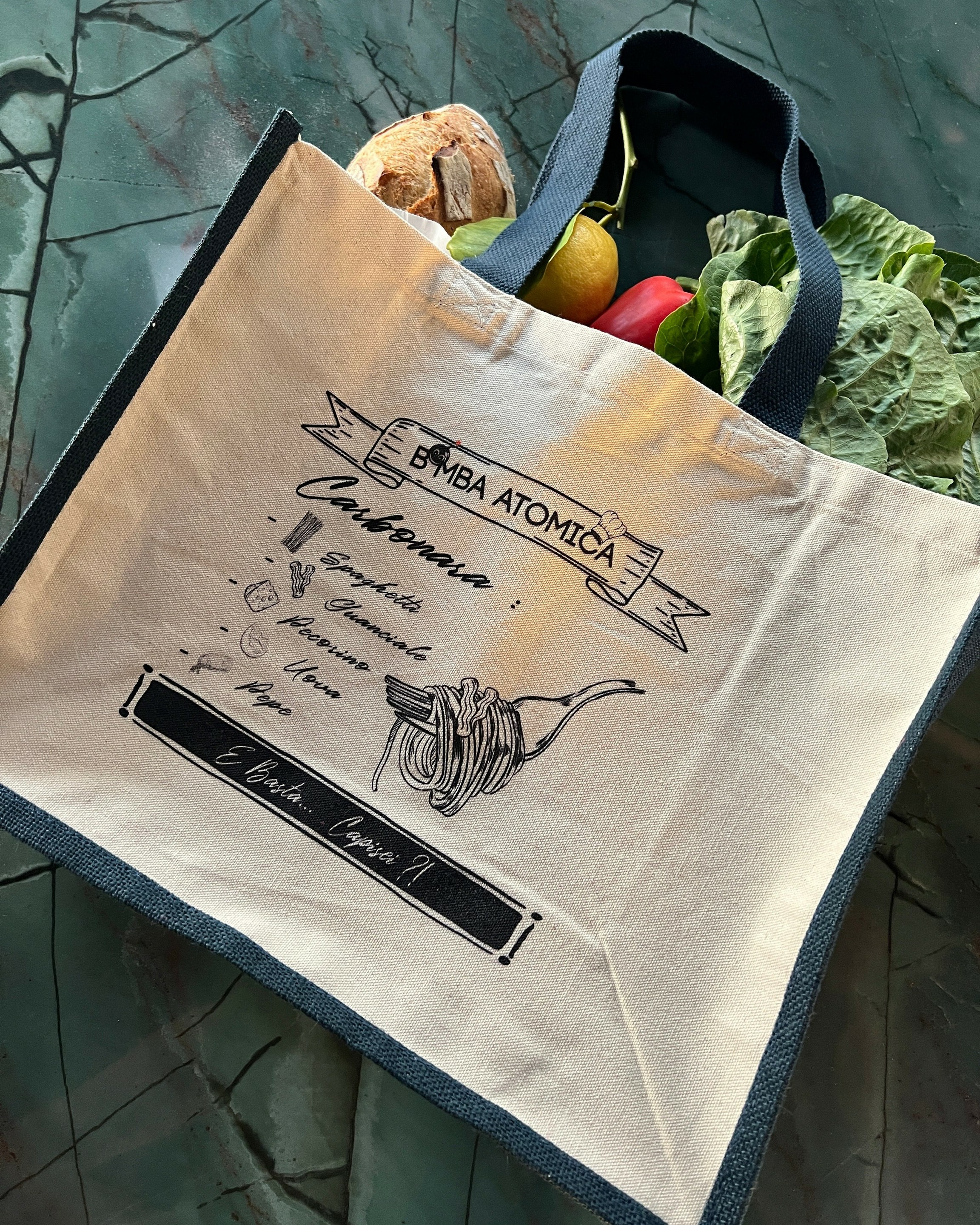Le Shopping Bag Carbonara, l’accessoire indispensable pour les vrais amateurs ! Idéal comme sac pour faire les courses, il vous accompagne partout. Avec son motif affichant la vraie recette de la carbonara, c’est un must-have en édition limitée.