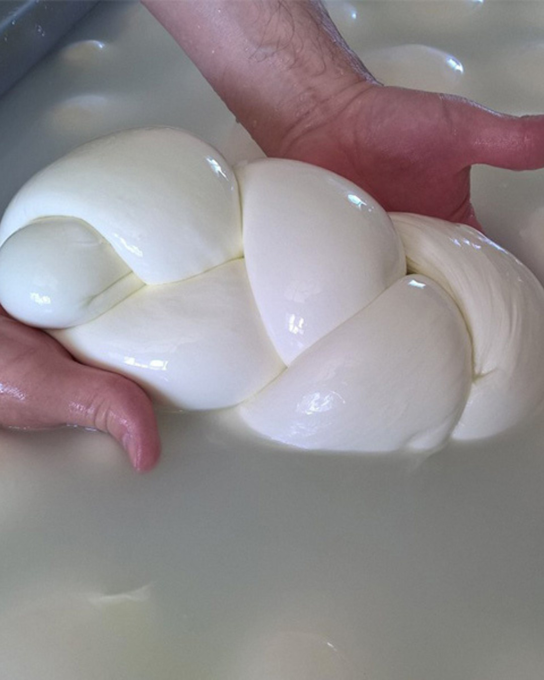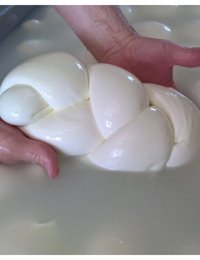 Treccia fiordilatte 1Kg (tresse au lait cru de vache). Cette mozzarella fraîche en forme de tresse, fabriquée à partir de lait cru de vache a une texture douce et filante, avec un goût laiteux et délicat.