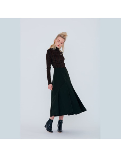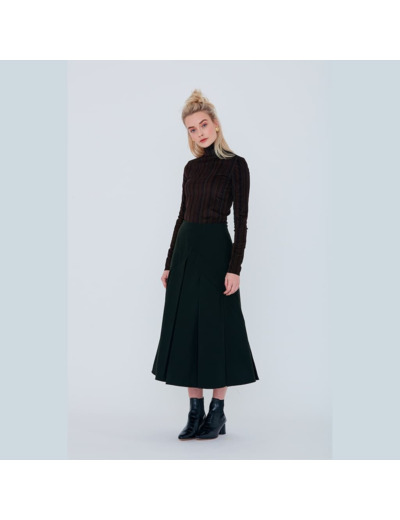 Pour lui donner une allure tout à fait moderne, nous lui avons adapté un empiècement sur le devant, séparé par une bande, qui se prolonge sur le dos, définissant alors une partie basse plissée et une partie haute non plissée. Sur le devant, nous pouvons considérer que l’empiècement représente 30% de la hauteur de la jupe, alors que sur le dos, il représente environ 80%. Avec ce jeu de découpes, cette jupe devient tout à fait intéressante. Les plis d’une profondeur assez importante, se développe d’une manière symétrique de chaque côté du milieu devant.