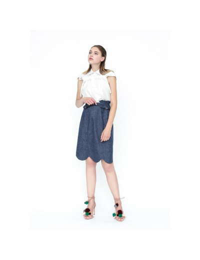 Pour ce top, nous avons voulu jouer les volumes avec des liens permettant de coulisser à discrétion les deux parties haute, augmentant alors le volume créé par un volant.