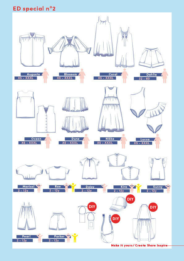 Avec pas moins de 19 patrons estivaux au lieu des 12 habituels ainsi que des projets DIY, tout le monde trouvera son bonheur. Dans cette édition nous te proposons des patrons innovants, comme un maillot de bain unique et une casquette tendance ! Une journée à la plage, un voyage, des barbecues chaleureux, des fêtes... tu trouveras dans cette édition la bonne tenue pour chaque occasion 😉Adapte les patrons à ta guise et combine-les pour réaliser des créations spectaculaires. Finis ta tenue d'été avec le sac Mehri intemporel et tellement pratique, ou un autre projet DIY.