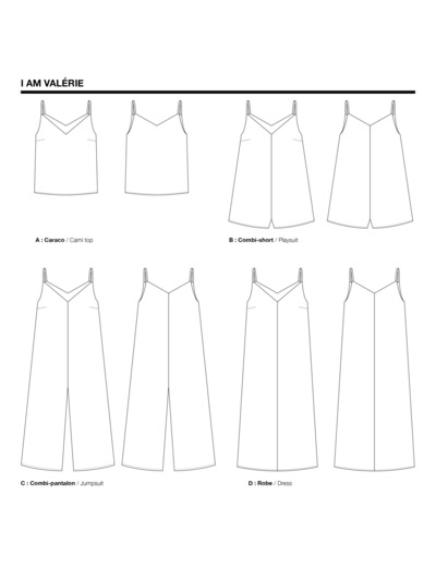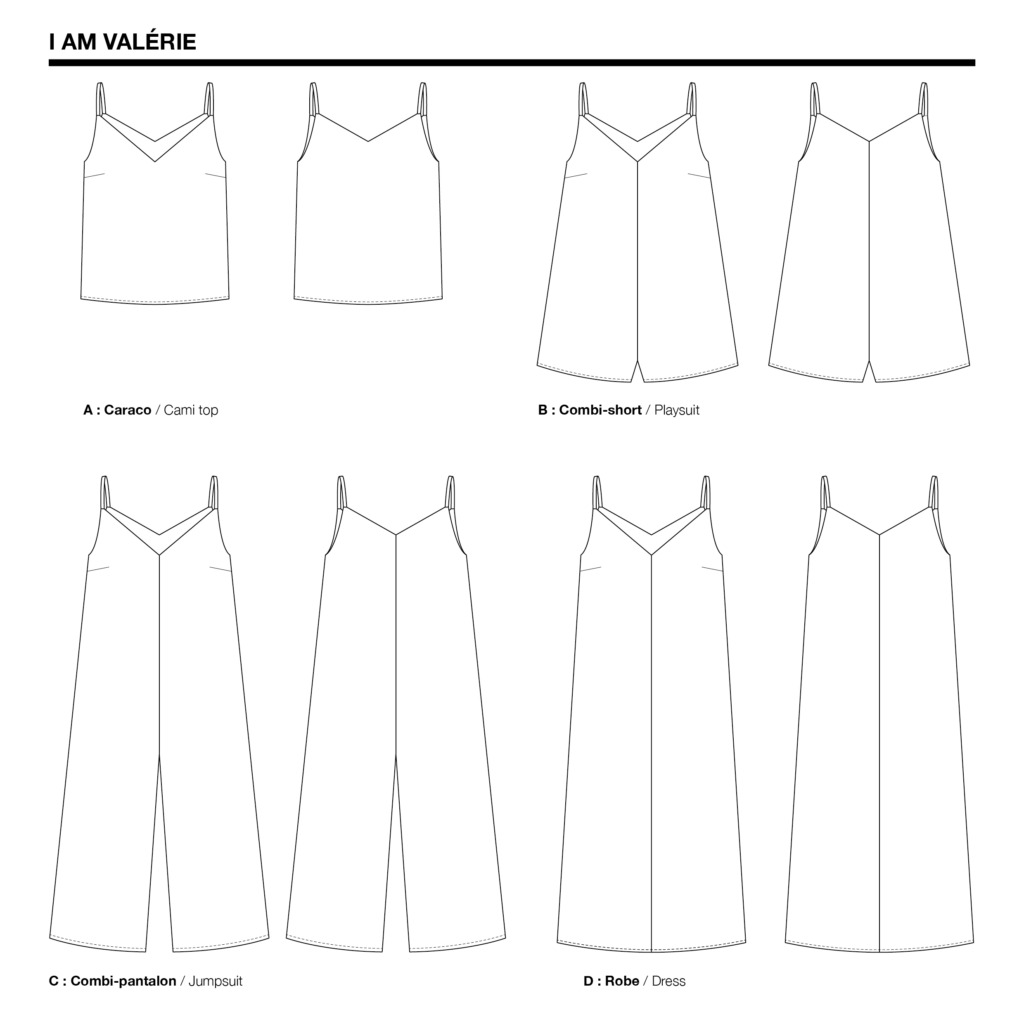 "I am Valérie" est une combinaison qui allie simplicité et confort avec un look contemporain. Elle se compose d’un haut caraco classique et je me décline en robe longue, en combinaison pantalon et en combinaison short. Ses décolletés devant et dos sont un parfait équilibre entre féminité et aisance. Simplisme à coudre comme à porter, elle est la tenue parfaite des beaux jours.