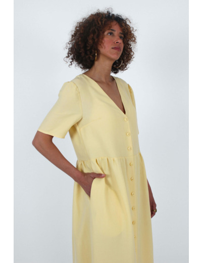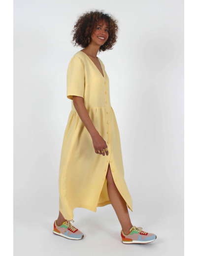 Les versions robes sont dotées d’une jupe froncée à la taille avec poches, et il est possible de l’accessoiriser avec une ceinture amovible selon vos envies. Pour chaque version, il peut être boutonné sur le devant ou non, et il se décline sans manches, avec des manches courtes, des manches 3/4 ou des manches papillon.