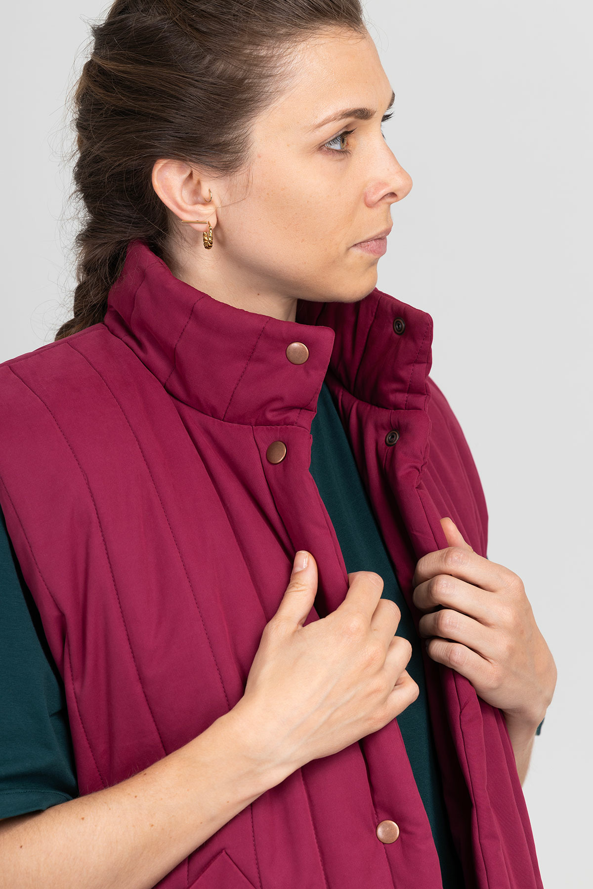 "I am Mira" est une veste sans manches oversize entièrement doublée, à la fois élégante et décontractée. Elle peut être fermée avec des boutons ou une fermeture à glissière, et son encolure peut être finie avec un col, une capuche, ou laissée ronde. Choisissez entre deux types de poches, passepoilées ou plaquées. Avec les trois longueurs (bassin, genou, cheville) et son cordon de resserrage, elle parfaite pour toutes les saisons.