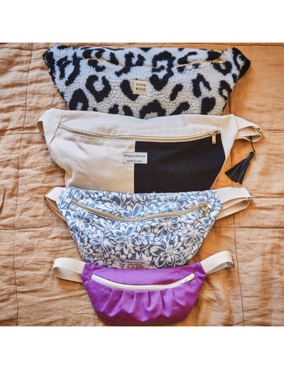 Le patron de sac de banane propose 3 tailles et 3 options de forme, pour accompagner la famille dans les activités du quotidien. Il existe une option de forme basique, une option avec 2 panneaux devant pour travailler des effets bicolores et une option de forme avec plis plats devant. Le dos peut également se faire simplement en une pièce basique ou avec une poche zippée incrustée.