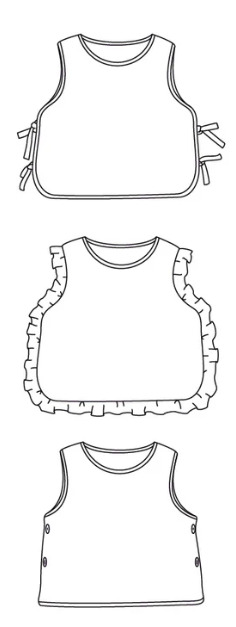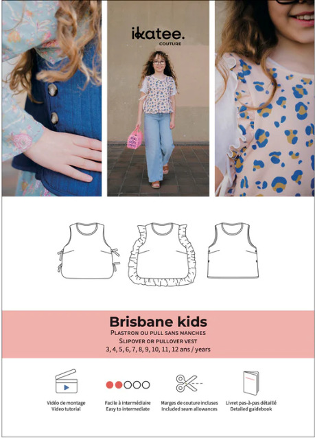 Brisbane kids est un patron de plastron ou pull sans manches pour enfant, avec une ouverture sur les côtés et des finitions très soignées. La forme est ample. Le modèle est entièrement doublé et en option, gansé. En option, on peut ajouter ou non des volants. Le plastron se ferme avec des liens ou des boutons.