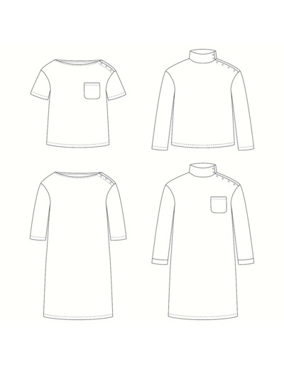 Ce patron polyvalent permet de créer aussi bien un t-shirt qu’une robe marinière, avec 4 options de manches (courtes, 3/4, longues avec ou sans poignets) et 2 styles d’encolure (bateau ou col montant). Détails pratiques et charmants : ouverture à l’épaule pour un habillage facile et poche poitrine pour la touche finale.