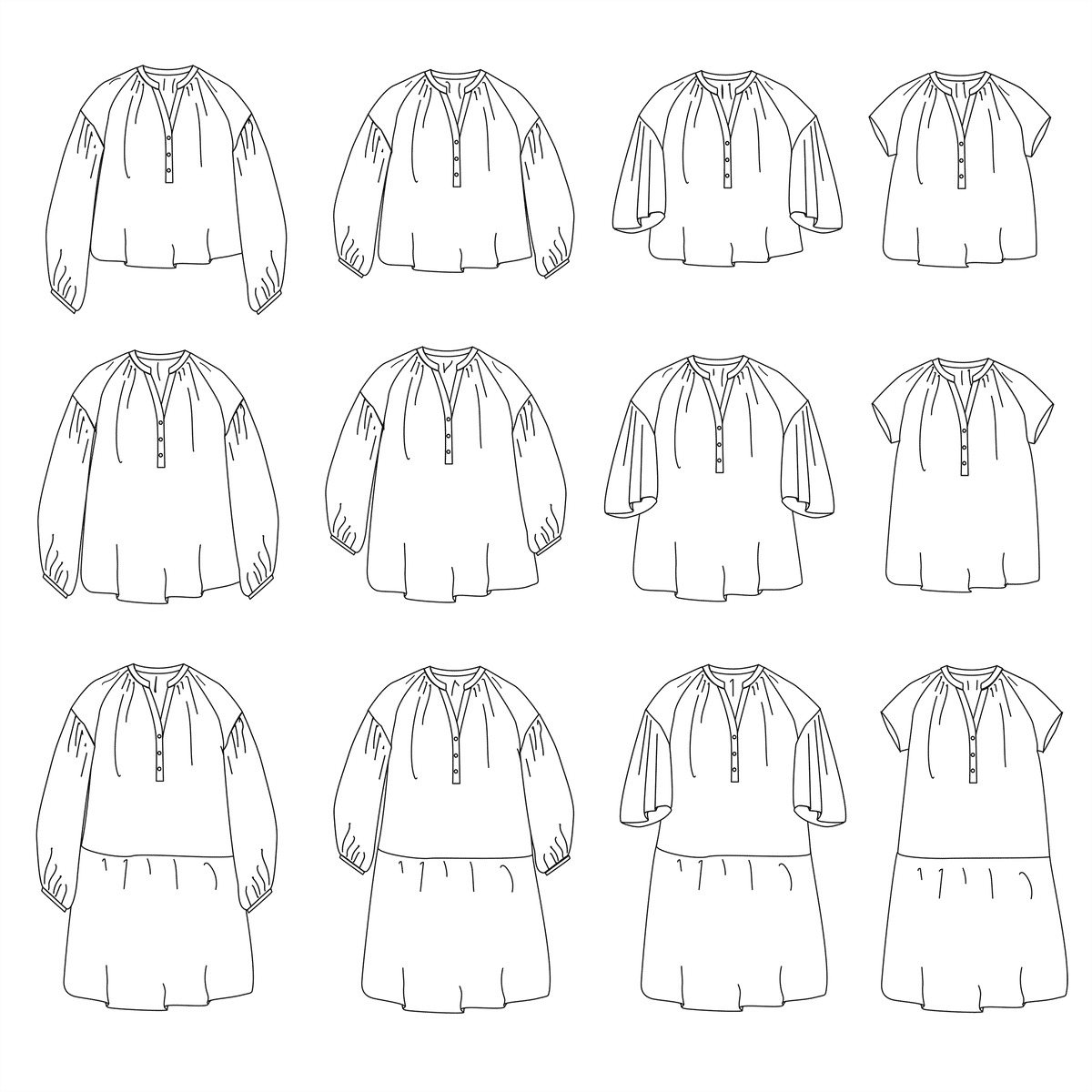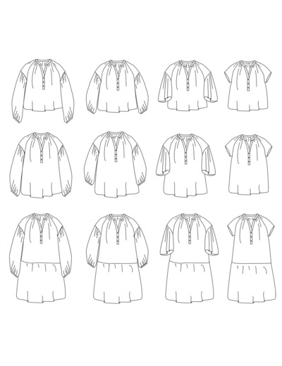 Patron de blouse ou robe femme. Coupe ample, emmanchure raglan. 3 longueurs : blouse courte (haut des hanches), blouse longue (mi-hanches) ou robe au-dessus du genou. Encolure avec col et patte partielle. 4 options de manches : courte, évasée au coude, longue ou 3/4 froncée au poignet. Fronces à l'encolure devant et dos. Un vêtement confortable pour des looks bohème chic.