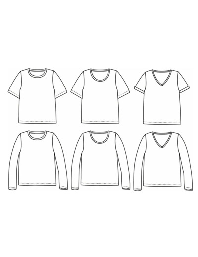 Il propose de nombreuses variantes : manches courtes, manches courtes avec revers ou manches longues, col rond, col dégagé ou col en V. Un indispensable de la garde-robe, simple et rapide à réaliser.