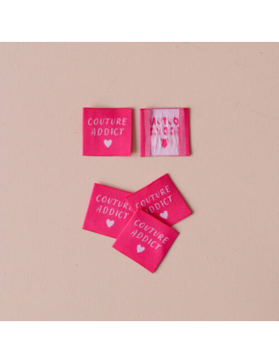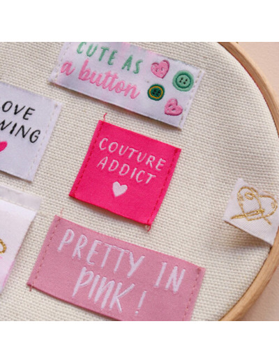 Lot de 5 étiquettes à coudre, avec l'écriture blanche sur le fond rose.