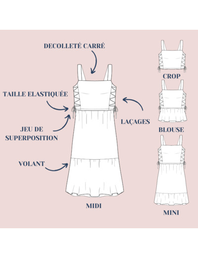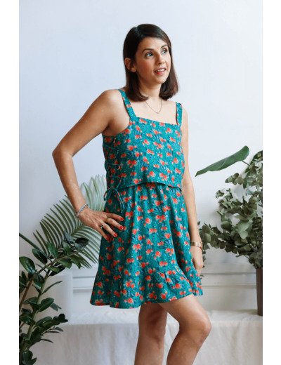 En crop top, en blouse, en robe courte ou midi, les possibilités sont nombreuses de la robe Romance. Jouez l’illusion avec cette pièce qui se porte comme un ensemble top & jupe d’un seul tenant. Le buste au tombé droit se positionne sur une robe élastiquée à la taille pour accentuer l’effet de superposition. Les larges bretelles et le décolleté carré sont adoucis par un délicat laçage sur les côtés que vous pouvez réaliser ou non. La jupe froncée avec une découpe lui apporte une touche bohème et romantique.