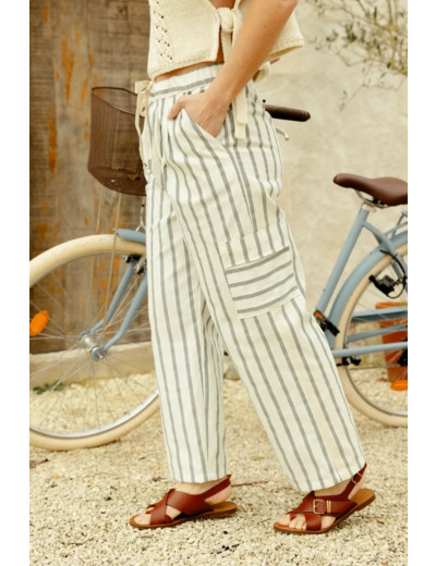 Le pantalon est idéal pour revaloriser un rideau léger en lin ou en coton. Les revers, sacs et fonds de poche peuvent être réalisés à partir d’anciens draps ou de chutes de tissus. Les poches côtés peuvent être confectionnées à partir de petits napperons. Les cordons peuvent être des rubans ou des ficelles torsadées revalorisés sur d'autres vêtements.