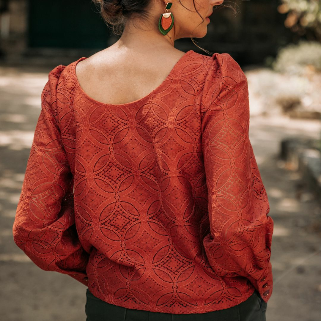 Le patron prévoit un niveau de finition très élevé et adapté aux tissus ajourés, avec la possibilité de doubler entièrement le buste, des coutures encolure et emmanchure gansées avec un biais et des marges de couture prévues pour assembler vos pièces avec des coutures anglaises sur le buste et les manches.