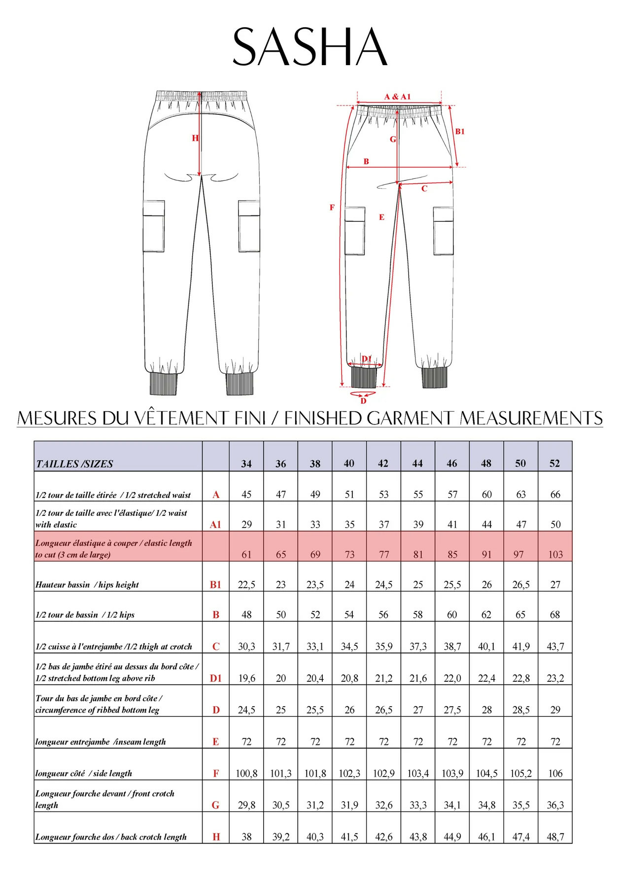 - Niveau de couture : DÉBUTANT, les points techniques sont la réalisation de la poche italienne qui se prolonge sur la taille, les poches plaquées à rabat, la taille élastiquée sous coulisse, et la pose d’un bas de jambe en bord côte.
