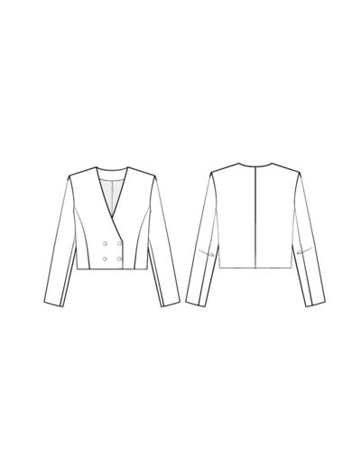 Sans col, avec un double boutonnage bas, son volume est travaillé par des découpes, et sa ligne d’épaule joliment définie et travaillée par un savant jeu de pli sur la tête de manche.