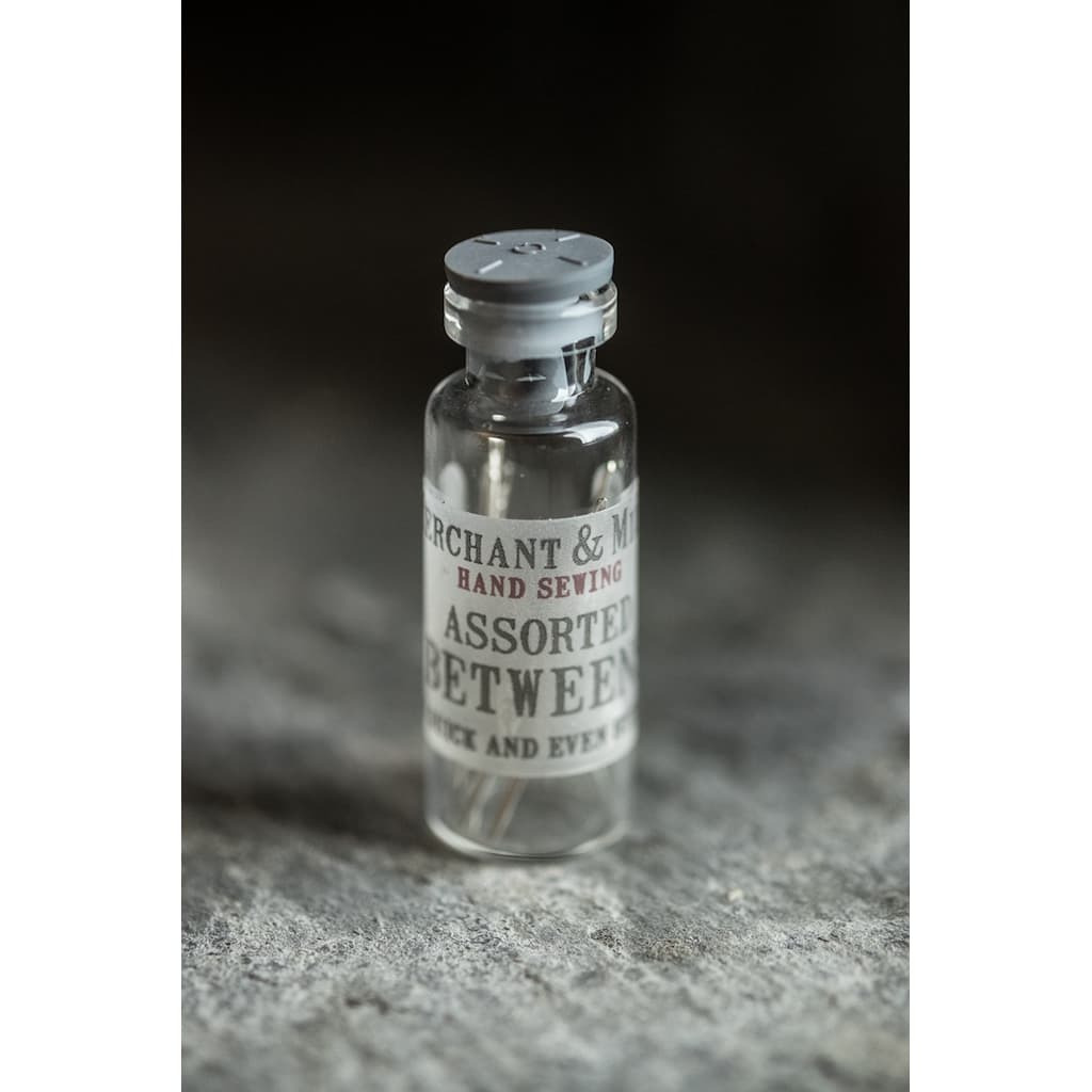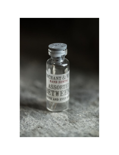 Un mélange de 10 tailles légèrement différentes regroupées dans un flacon en verre Merchant & Mills avec un bouchon en caoutchouc.