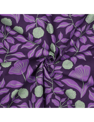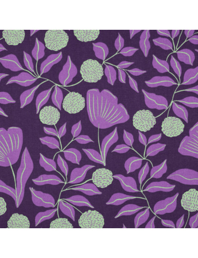 Tissu toile de coton assez souple à l'imprimé floral violet de la marque Nerida Hanssen. Ce tissu canevas 100 % coton a une belle tenue et sera parfait pour coudre les accessoires (sacs, pochettes) et les objets de déco coussins, nappes. Il peut également convenir pour coudre une veste structuré ou un manteau.