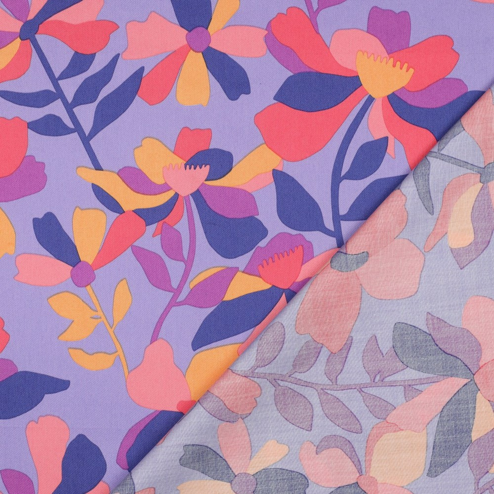 Le tissu Cloverdale de Nerida Hansen se décline ici dans une version vibrante et audacieuse, où un fond bleu indigo met en valeur de grandes fleurs stylisées dans des tons de corail, rose, orange et bleu. Un imprimé à la fois artistique et joyeux, idéal pour des créations lumineuses et modernes.