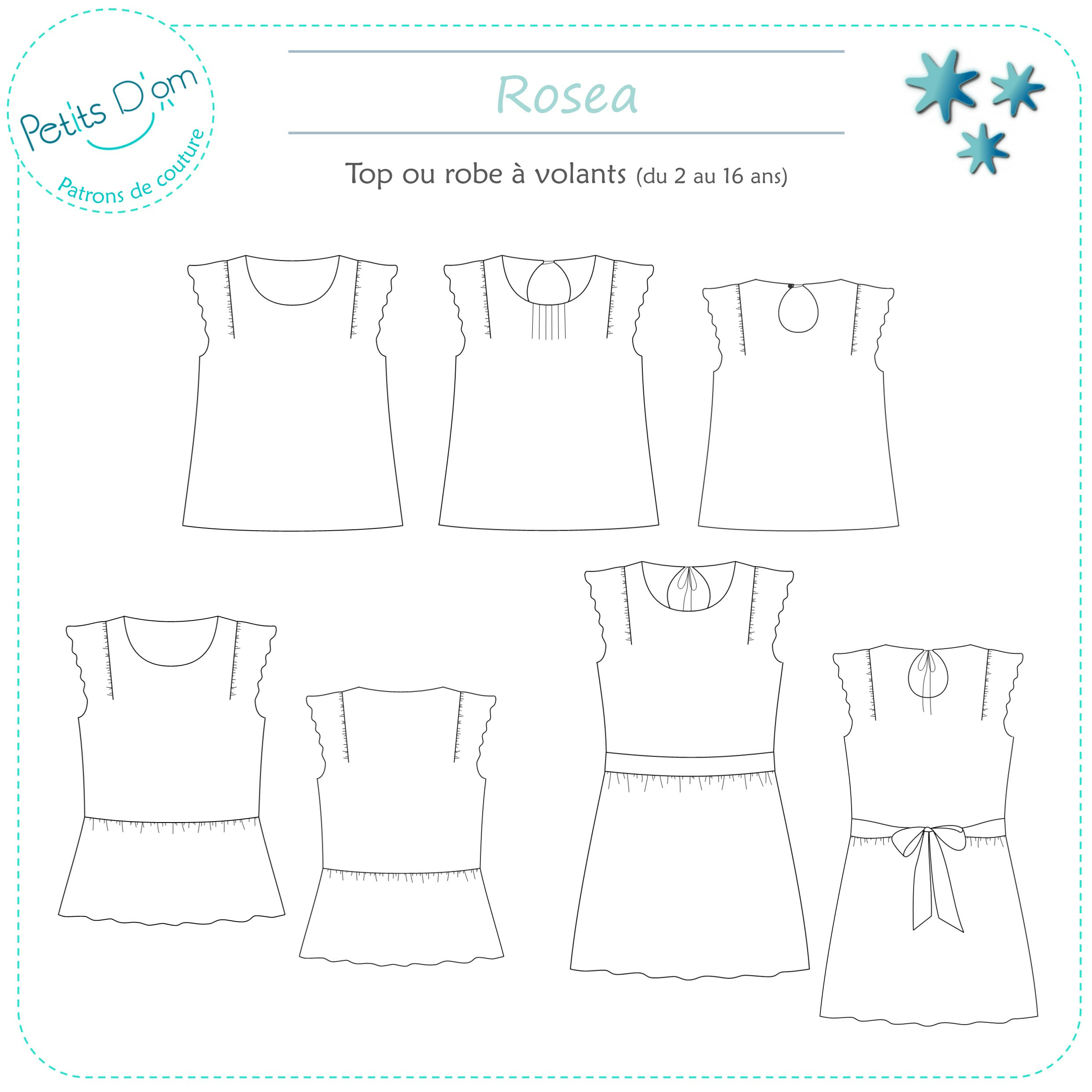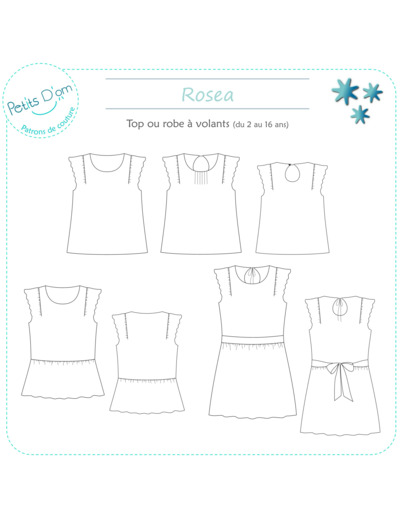 Le patron Rosea est un patron de couture pour fille gradé du 2 au 16 ans, permettant de réaliser au choix un top ou une robe.