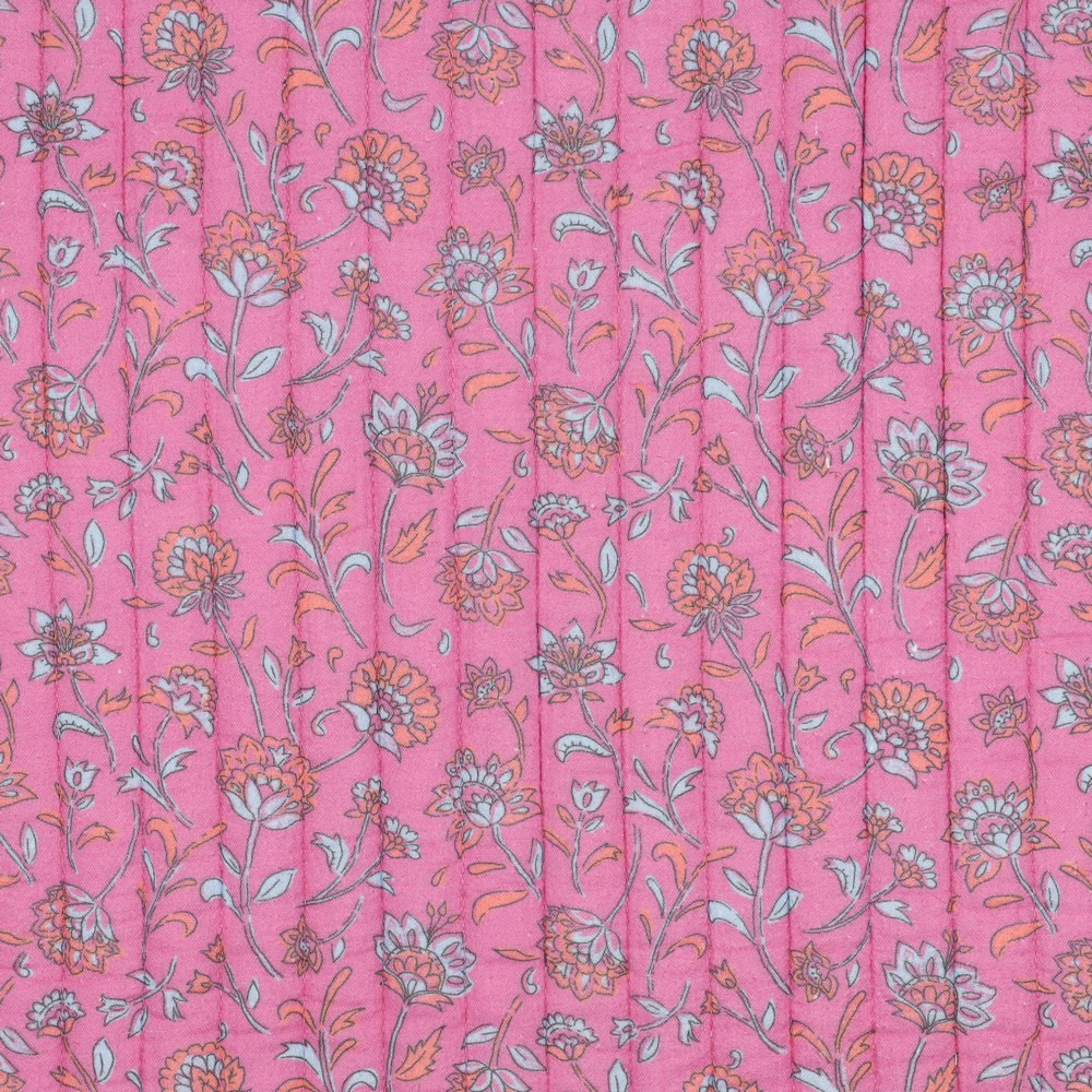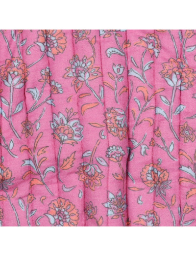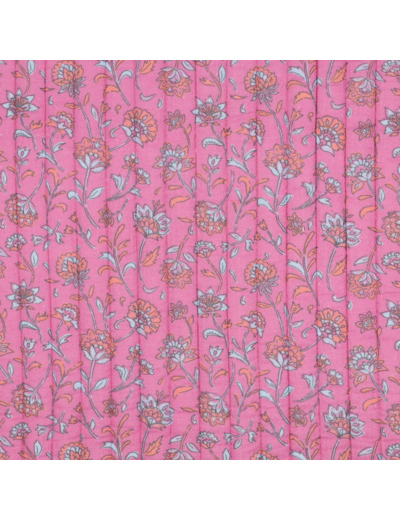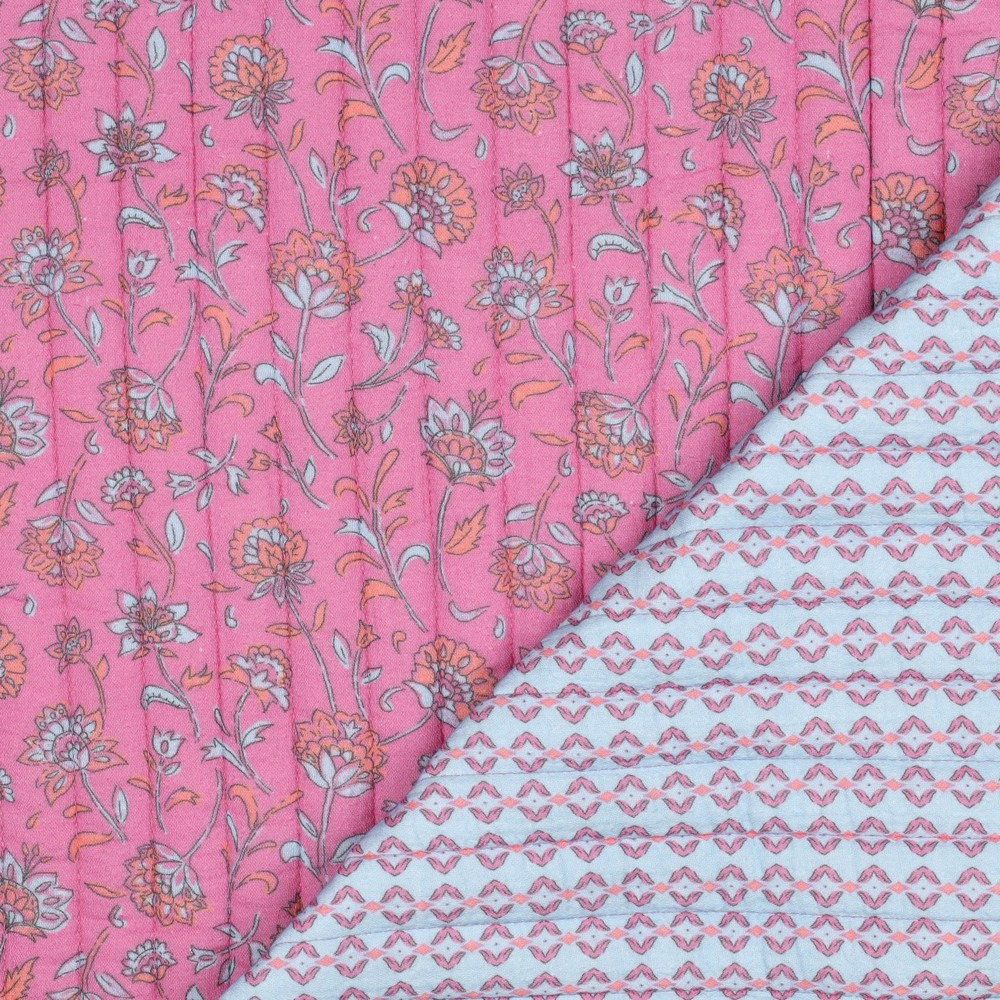 Apportez une touche de douceur et de poésie à vos créations avec cette double gaze matelassée imprimée. Son fond rose vibrant est rehaussé de jolis motifs floraux aux teintes douces (orangé, blanc, bleu clair), pour un effet à la fois délicat et chaleureux.