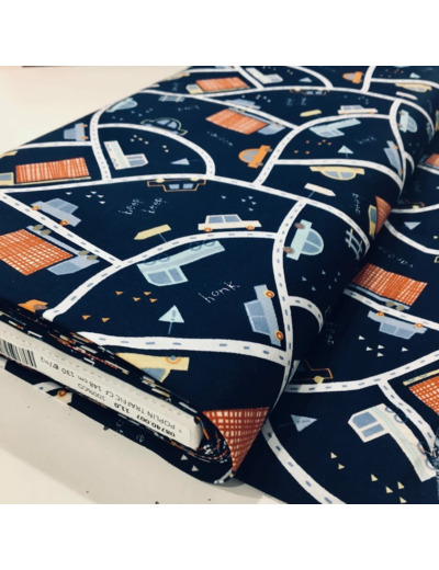 Cette ravissante popeline de coton bleu marine imprimé de la route avec de petites voitures sera parfaite pour vos créations pour les enfants: deco, tapis de jeux, pyjamas...