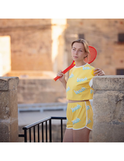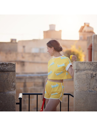 See You At Six - Tissu French Terry De Coton Imprimé "Beach" Sur Le Fond Jaune Millefeuille