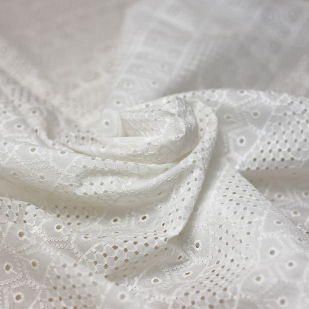 Très joli tissu broderie anglaise à motif bandes brodés sur le tissu blanc optique.