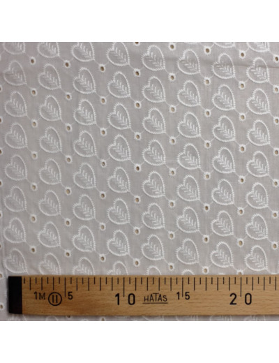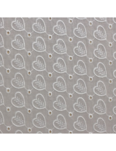 Très joli tissu broderie anglaise à motif coeurs sur le tissu blanc optique.