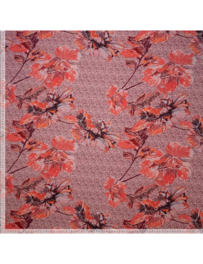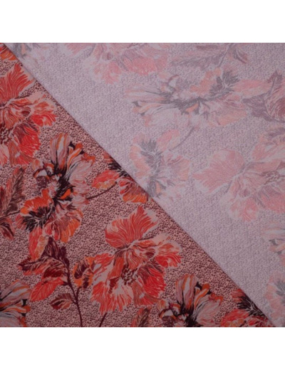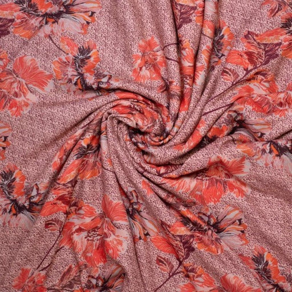 Joli crêpe de viscose assez lourd impression digitale à gros fleurs en rouge. Ce tissu est facile à coudre et agréable à porter.