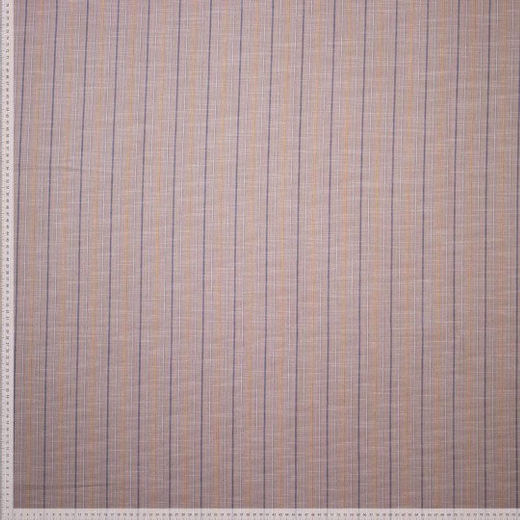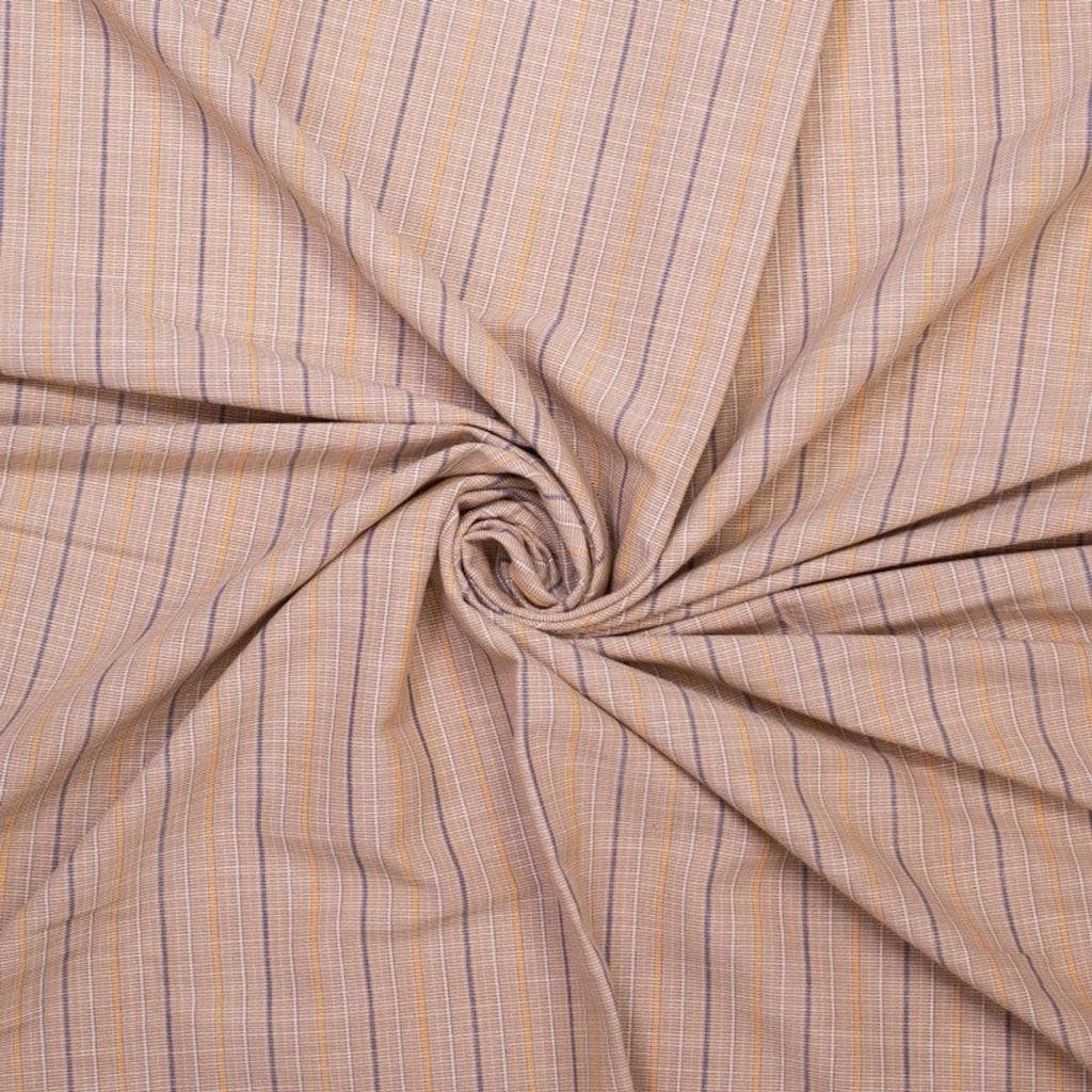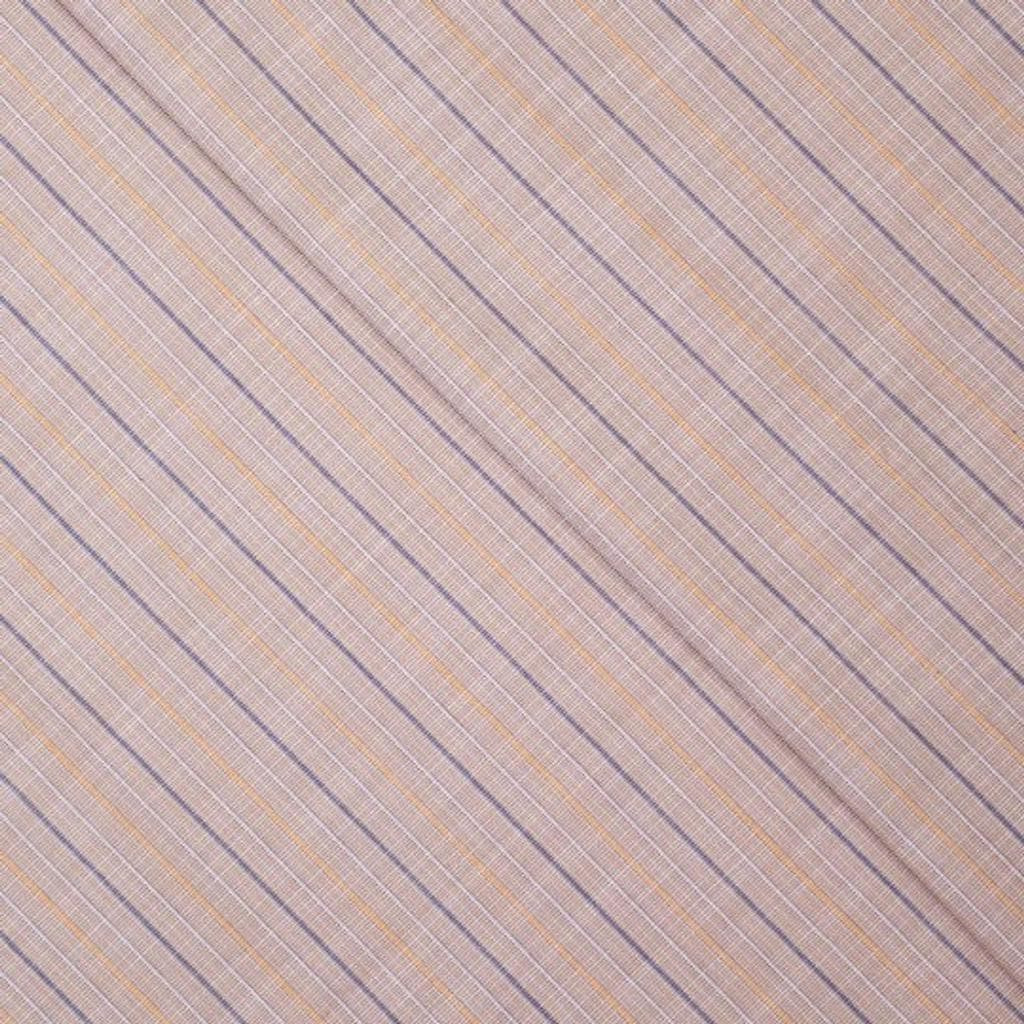 Tissu jacquard léger en coton à l'aspect lin à motif rayures fines violets, jaunes et blanches sur le fond beige.