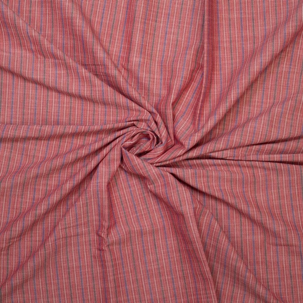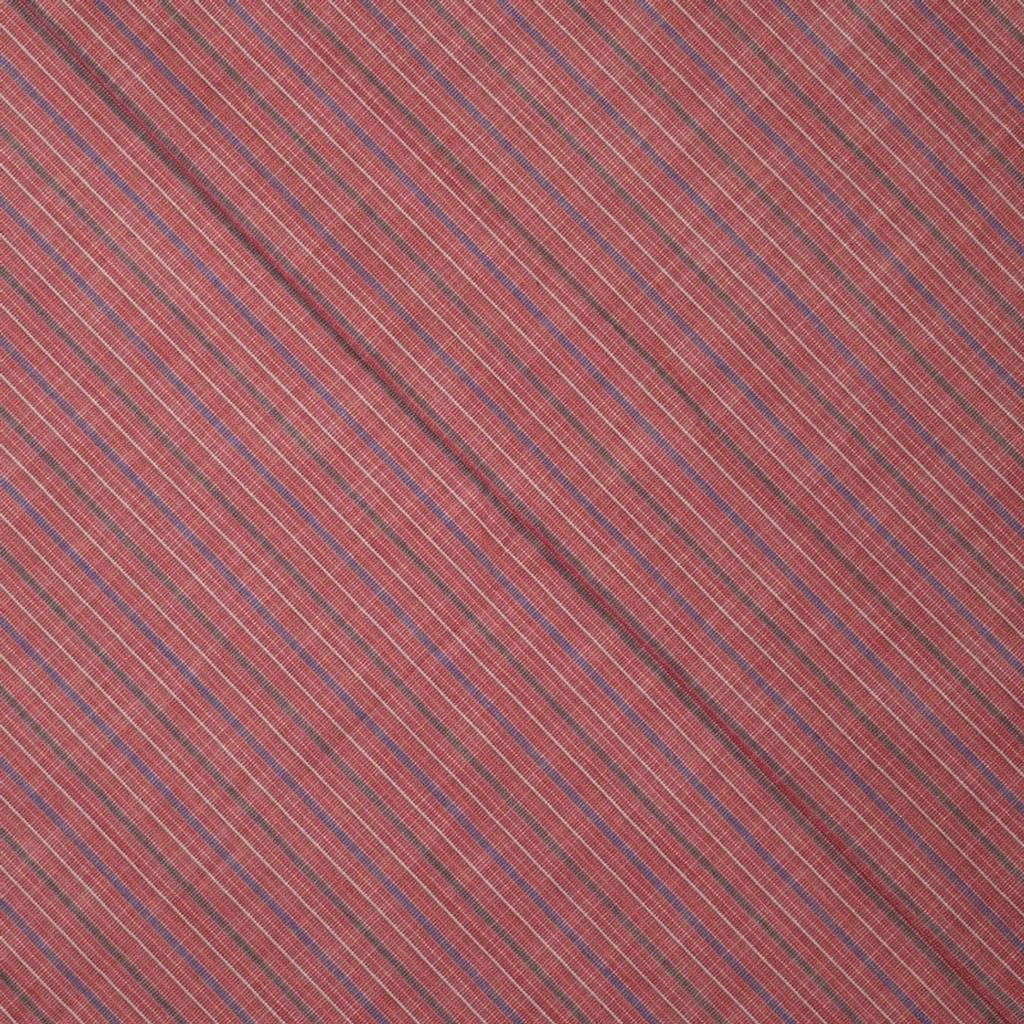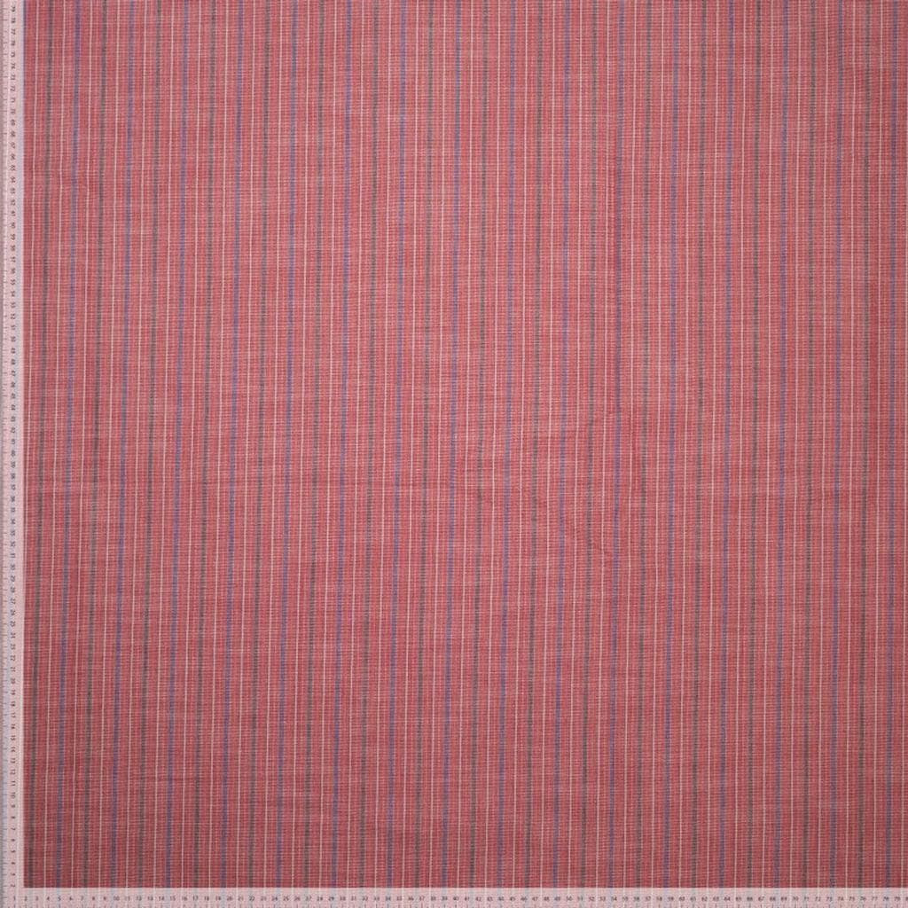 Tissu jacquard léger en coton à l'aspect lin à motif rayures fines bleues et grises sur le fond rouge.