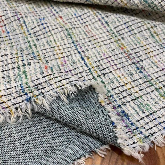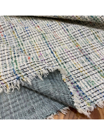 Tissu jersey maille Milano en coton mélangé à carreaux style tweed avec le fil lurex dans les tons de vert.