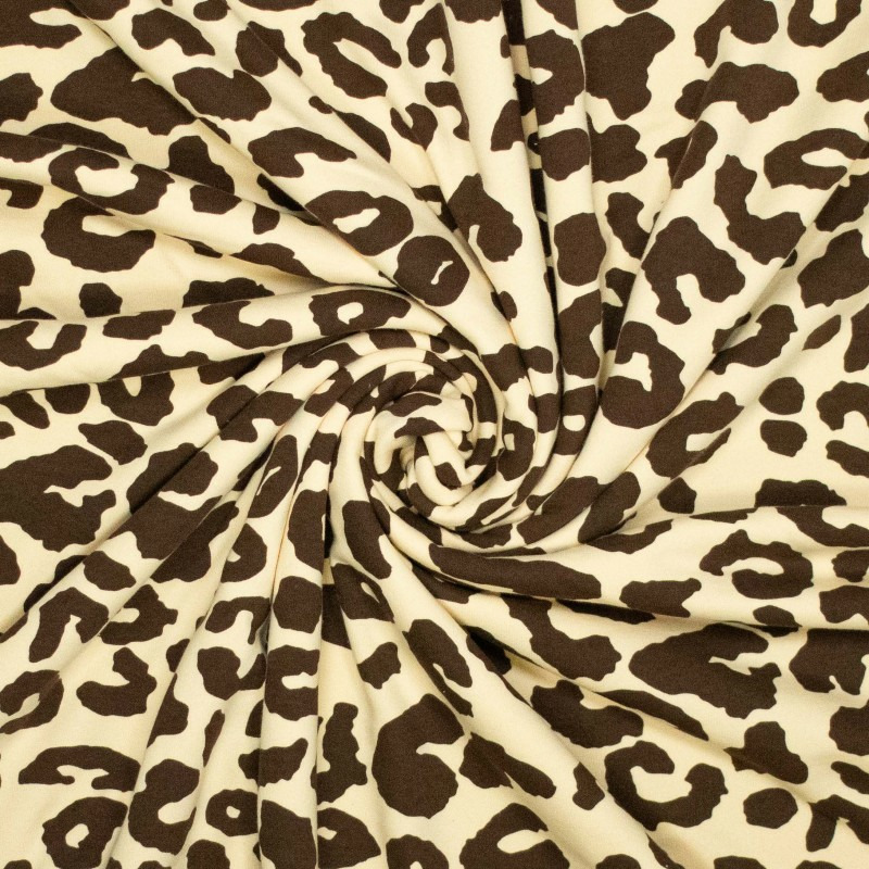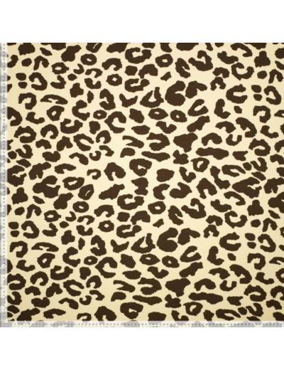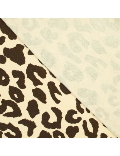 Tissu sweat extra chaud avec l'envers gratté tout doux. Imprimé grosses taches léopard couleur chocolat sur le fond beige clair.