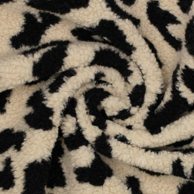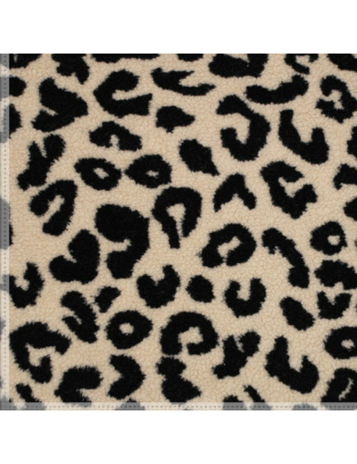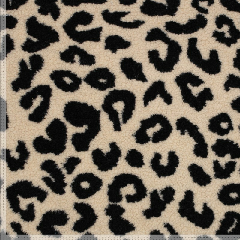 Tissu fausse fourrure type Sherpa en maille à motif léopard en couleurs beige et noir.