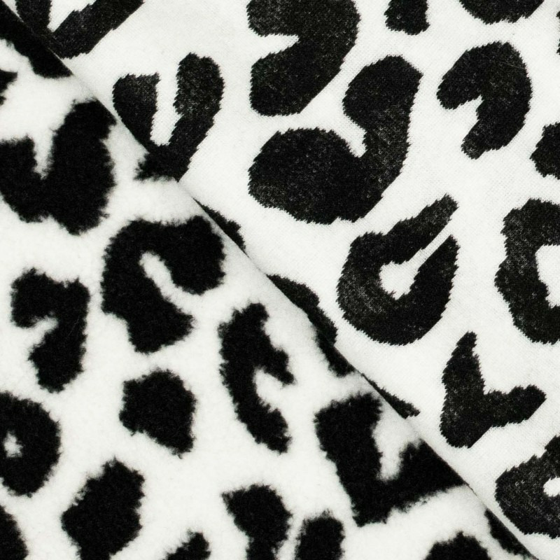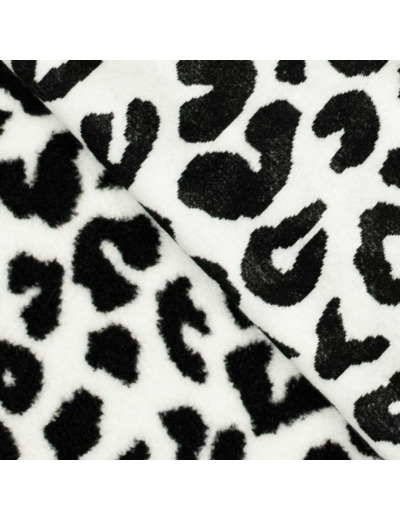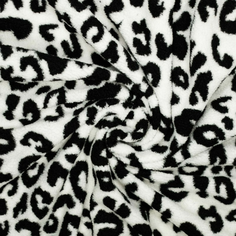 Tissu fausse fourrure type Sherpa en maille à motif léopard en couleurs noir et blanc.