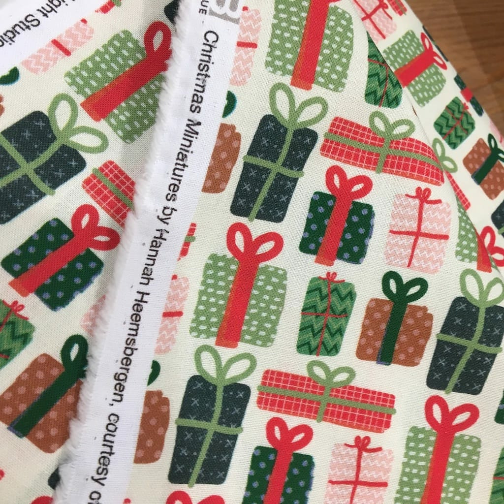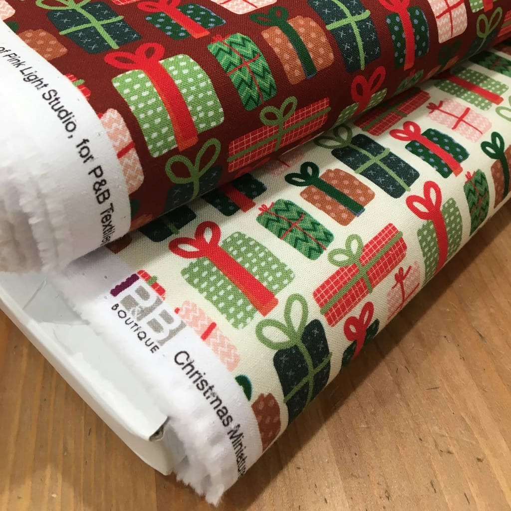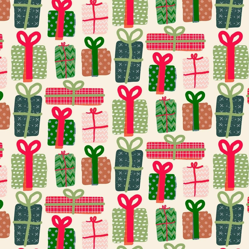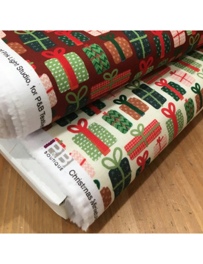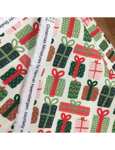 Popeline de coton de qualité patchwork (un peu plus épais que la popeline ordinaire, avec très bonne tenue) de la marque P&B Textiles, collection "Christmas Miniatures" imprimé paquets cadeaux sur le fond blanc crème.