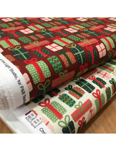 Popeline de coton de qualité patchwork (un peu plus épais que la popeline ordinaire, avec très bonne tenue) de la marque P&B Textiles, collection "Christmas Miniatures" imprimé paquets cadeaux sur le fond bordeaux.