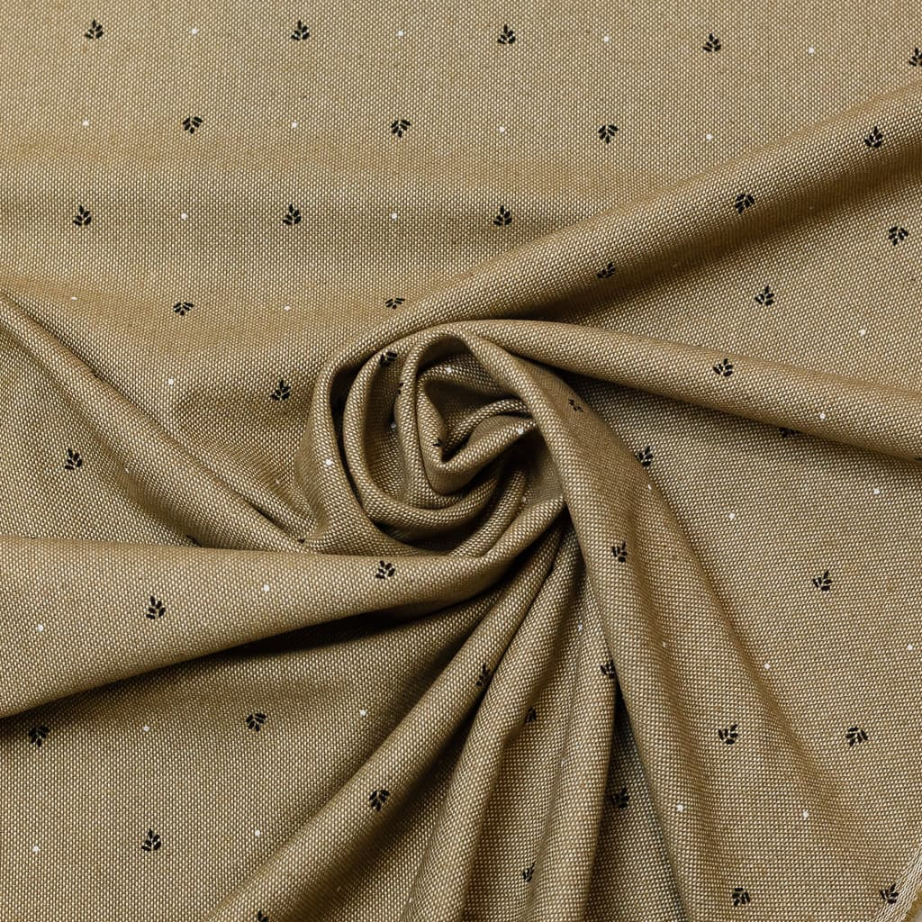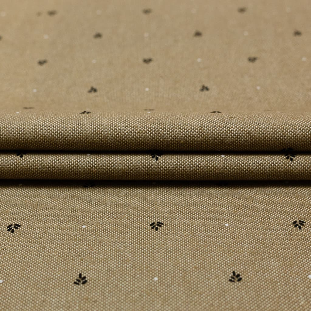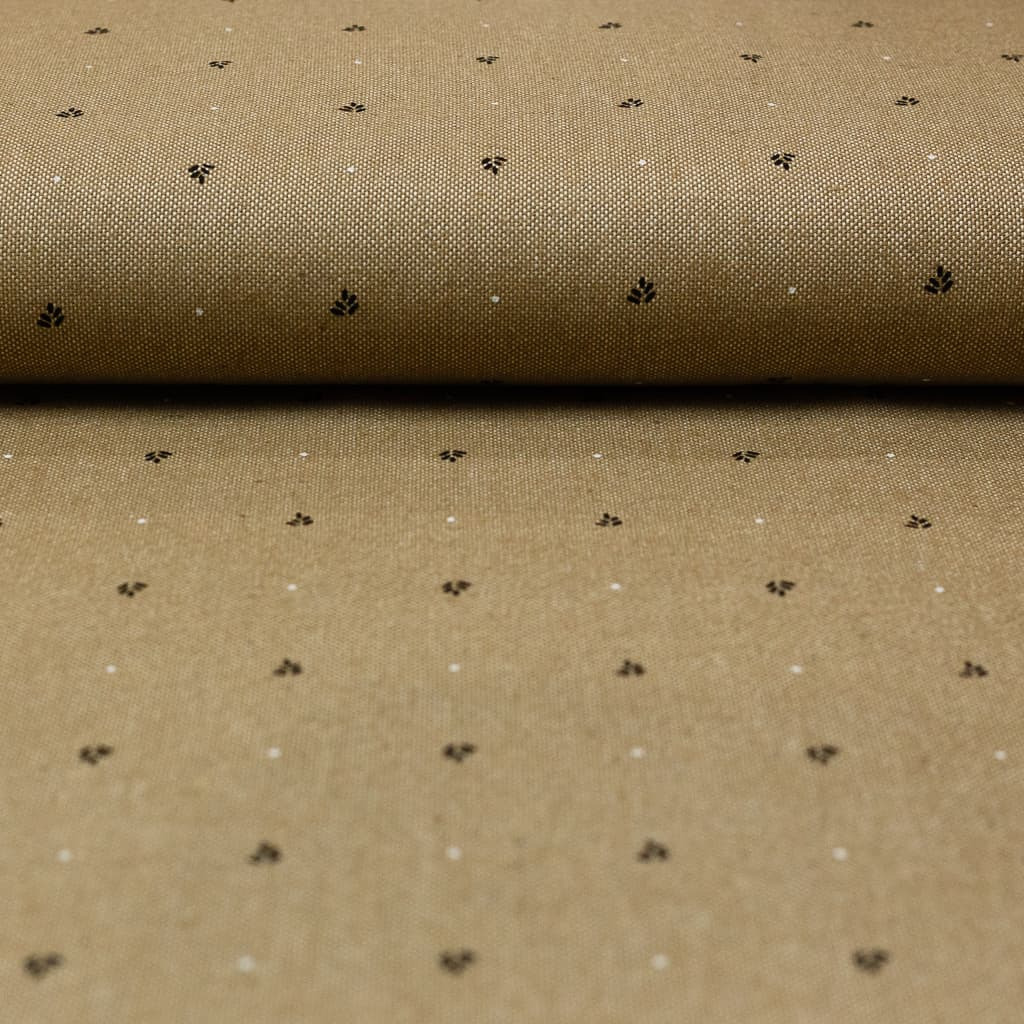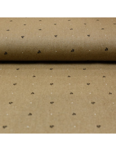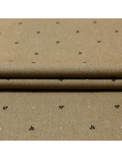 Tissu toile de coton légère imprimé petits feuilles noirs et points blancs sur le fond beige, comme imitation de toile de jute.