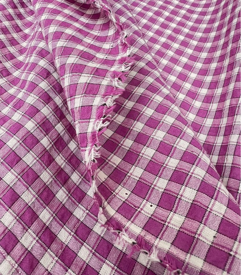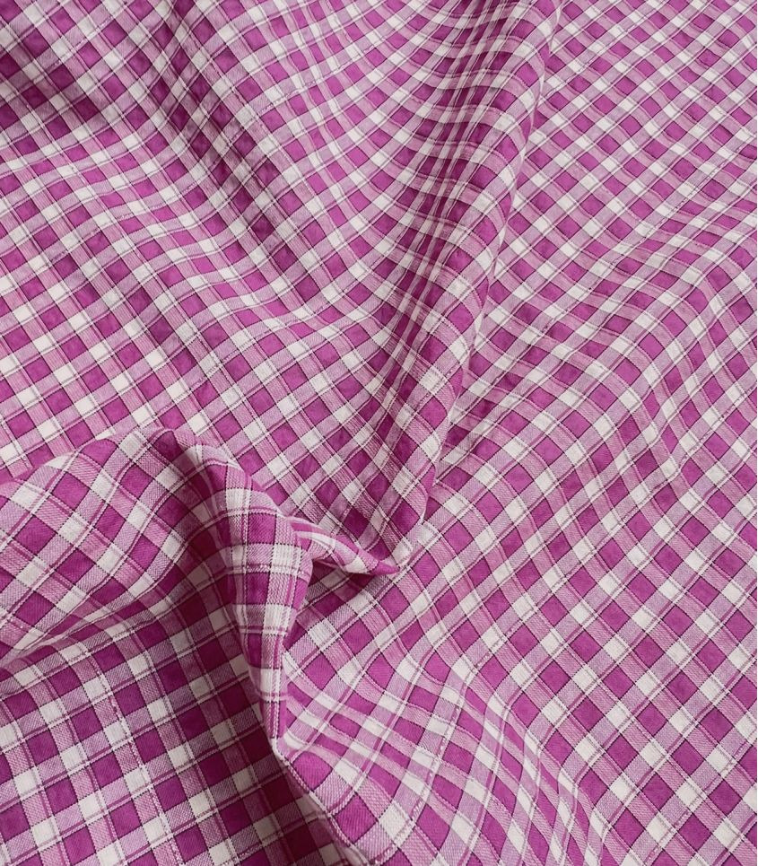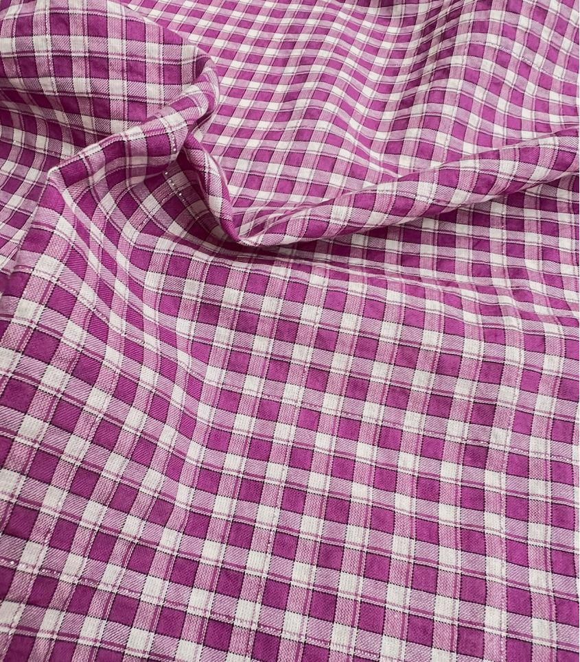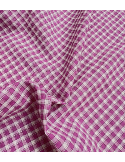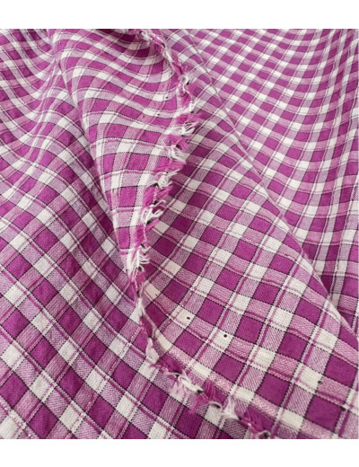 Tissu en poly/coton à carreaux écru et magenta (rose violacé), un fil de lurex vient souligné le carreaux. Tissu aérien et vaporeux à l'aspect légèrement gaufré style seersucker. Ce tissu est légèrement translucide, il nécessitera une doublure selon son utilisation.