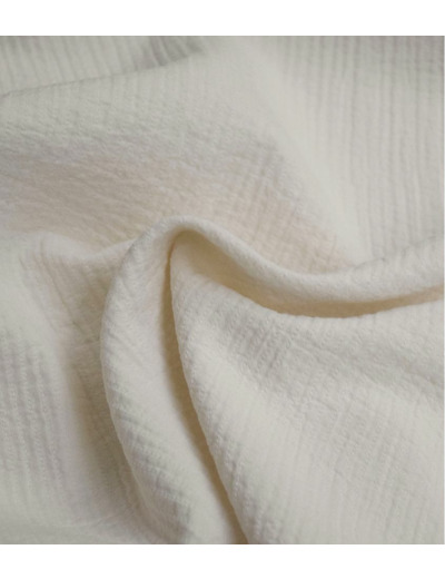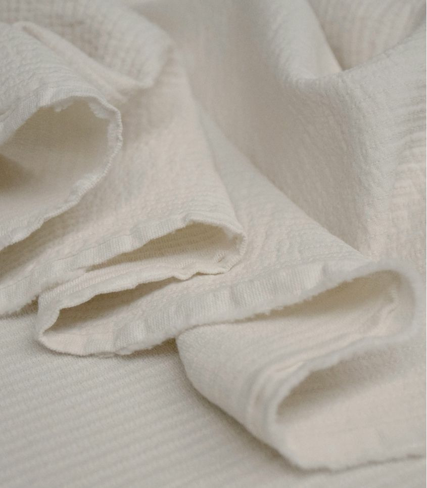 Tissu en coton écru composé de deux épaisseurs de coton fin. Les deux épaisseurs de tissus sont subtilement assemblées de coutures parallèles à la lisière formant une rayure verticale espacées de 5mm.