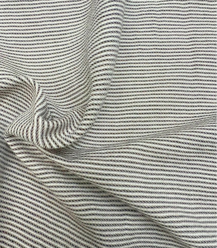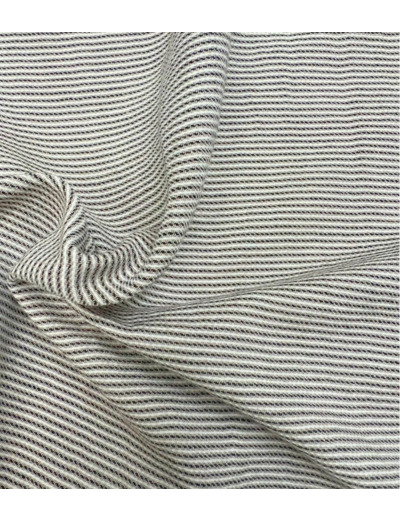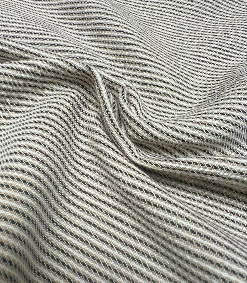 Coton léger à rayures beige, écru et charbon. Tissu bien souple, parfait pour la réalisation de robes, blouses, chemises ...