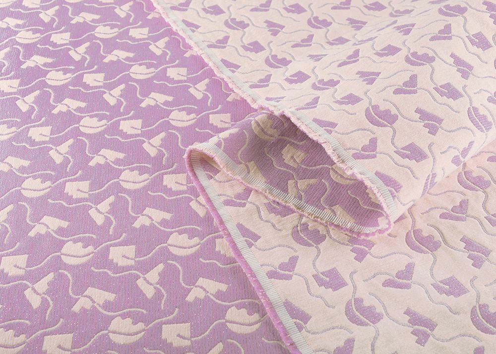 Succombez à ce tissu de couleurs champagne, parme et rose métallisé.