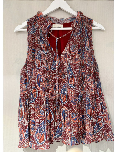 Tunique imprimée sans manches plis soleil, doublée rouge carmin