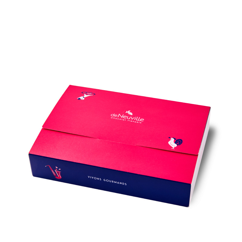 Ingrédients : Sucre, pâte de cacao, beurre de cacao, LAIT en poudre entier, AMANDES, NOISETTES, LAIT en poudre écrémé, beurre concentré (LAIT), sirop de glucose, crème stérilisée (LAIT), sirop de sucre inverti, humectant : sorbitol, cacao maigre en poudre, huile de tournesol, pâte de figues, graines de courges, noix de coco râpée, LAIT concentré écrémé sucré, poudre de lactosérum doux (contient du LACTOSE), caramel (sucre, eau), émulsifiant : lécithines (SOJA), purée de framboises, purée de cassis, pépites de cassis (jus de cassis), poudre de mûres ( jus de mûres concentré), extrait de chicorée concentré, café soluble 100% arabica Equateur, éclats de fèves de cacao torréfiées, épices, piment d'Espelette, fleur de sel de Guérande, sel, farine de BLE, farine de riz, farine de maïs, amidon de BLE, malt d'ORGE, blanc d'OEUFS en poudre, jus de citrons, jus d'oranges, arôme naturel de vanille, citron et noix de coco, anti oxydant : extrait de romarin, conservateur : sorbate de potassium, enzyme : invertase.| Marque | de neuville chocolat français |
