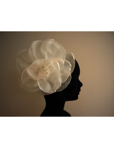 Rose En Organza Satin 100% Soie Façonnée À La Main De Couleur Blanc Ivoire ; Elle Est Montée Sur Broche Pour Orner Un Vêtement Ou Un Accessoire. La Tige Est Flexible Et Permet De Mettre La Fleur Sur Un Chapeau Ou L'Insérer Dans Une Coiffure, Par Exemple.